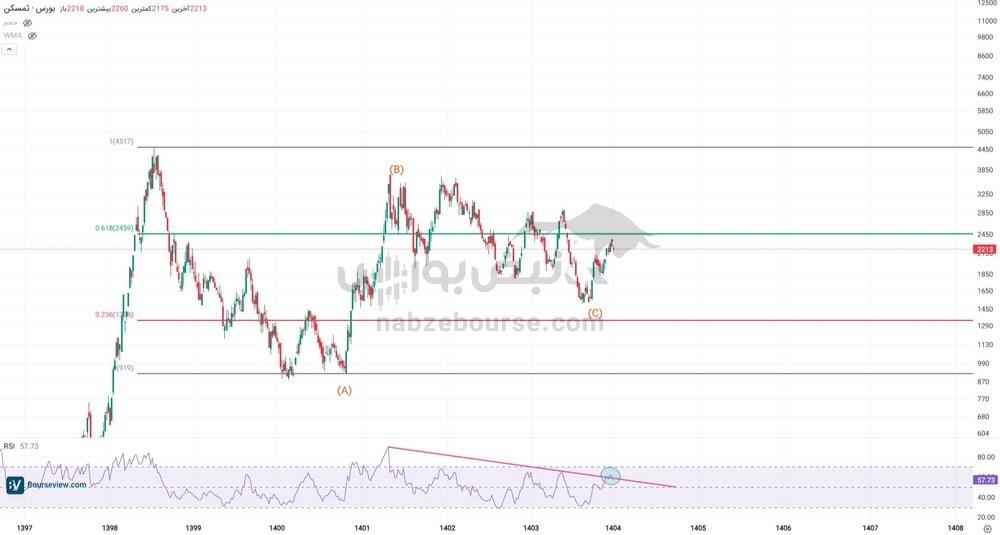 در دو سال اخیر، گسترش واگرایی مثبت میان نمودار قیمت و اندیکاتور RSI بهتدریج سیگنالهای هشداردهندهای از تضعیف روند نزولی صادر کرد. این سیگنال در نهایت با رشد پرشتاب قیمت تأیید شد و سهم توانست در دو موج صعودی، تا سطوح فیبوی 0.23 و 0.61 اصلاح اخیر به ترتیب در محدودههای ۱۳۰ و ۲۴۰ تومان پیشروی کند و بخش عمدهای از افتهای گذشته را جبران نماید.