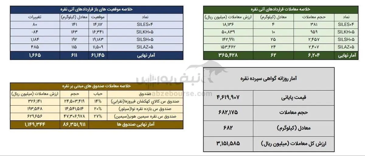 در صندوق های مبتنی بر نقره نیز ۸۶ میلیون و ۳۵۲ هزار واحد به ارزش ۱۱۴.۹ میلیارد تومان مورد دادوستد قرار گرفت.