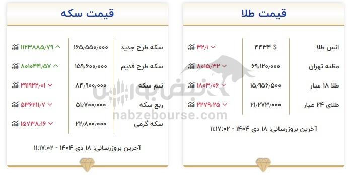 به گزارش نبض بورس، امروز پنجشنبه ۱۸ دی ۱۴۰۴ تا لحظه نگارش این خبر با کاهش قیمت طلا ۱۸ عیار همراه شد؛ اما قیمت سکه امامی افزایش داشت و انس جهانی نیز با افت همراه بود.
