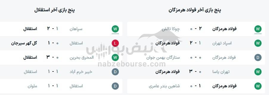 در پنج بازی اخیر استقلال 2 مساوی و 2 برد و1باخت حاصل شده است و در پنج بازی اخیر فولاد هرمزگان 1مساوی و 4 برد حاصل شده است.