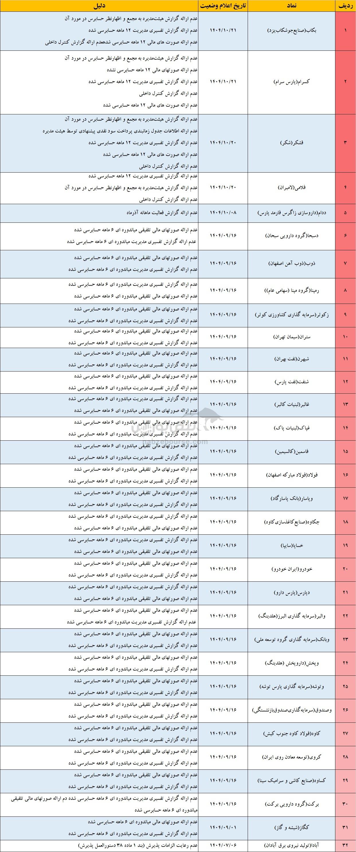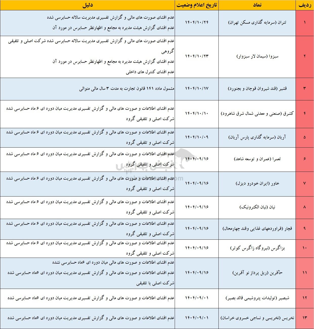 بررسیهای بورس تهران و فرابورس ایران نشان میدهد که در حال حاضر ۴۵ نماد بورسی و فرابورسی در وضعیت مشمول فرآیند تعلیق قرار دارند؛ شرایطی که زنگ خطری جدی برای سهامداران این شرکتهاست. در این حالت معاملات همچنان ادامه دارد، اما در صورت تداوم تخلفات یا عدم رفع دلایل، حکم تعلیق کامل نماد صادر خواهد شد. از میان این نمادها، ۳۲ نماد در بورس تهران و ۱۳ نماد در فرابورس مشمول این فرآیند شدهاند و سهامداران آنها باید با احتیاط بیشتری این نمادها را دنبال کنند. این نماد کدامند؟