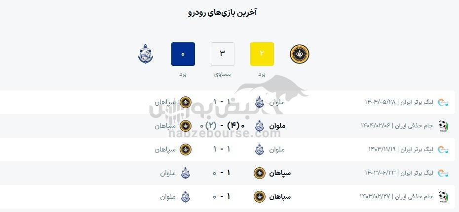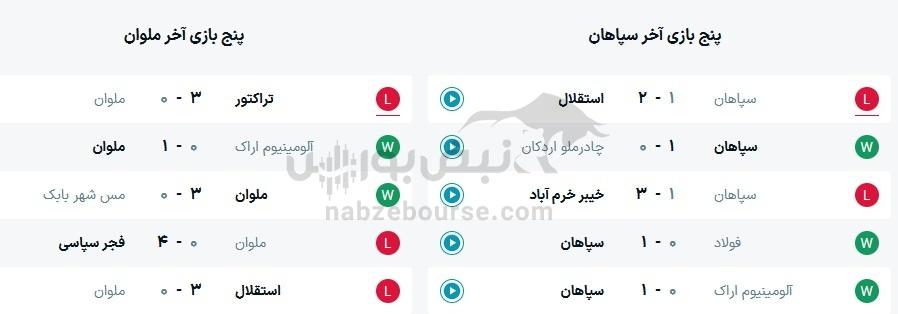 در پنج بازی اخیر 3 برد و 2 باخت برای سپاهان حاصل شده است و همچنین در پنج بازی اخیر ملوان 3 باخت و 2 برد حاصل شده است.