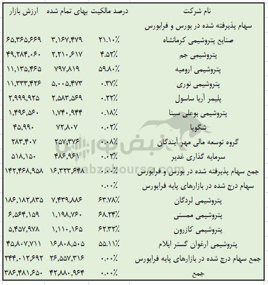 در آخرین گزارش ماهانه هلدینگ یعنی آذرماه، ۶۰٪ پتروشیمی ارومیه، ۲۱٪ صنایع پتروشیمی کرمانشاه، ۴.۵٪ پتروشیمی جم، ۶۴٪ پتروشیمی لردگان و چند پتروشیمی مطرح دیگر متعلق به این هلدینگ میباشد.
