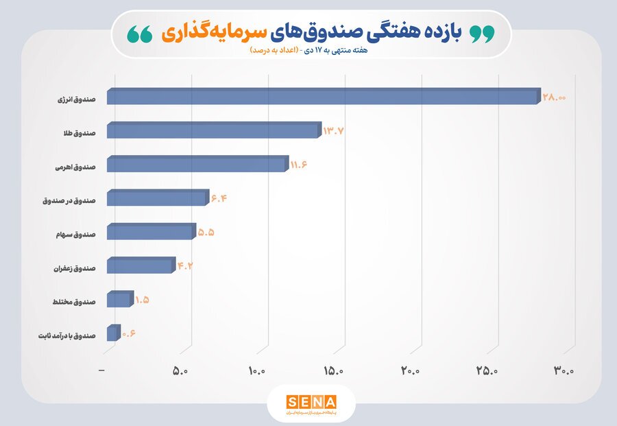به این ترتیب در دوره یاد شده صندوق‌های سرمایه‌گذاری اهرمی، صندوق در صندوق‌ها، سهامی، در اوراق بهادار مبتنی بر کالا(زعفران)، مختلط و در اوراق بهادار با درآمد ثابت به ترتیب مثبت «۱۱.۶»، «۶.۴»، «۵.۵»، «۴.۲»، «۱.۵»، «۰.۶» بازده کسب کرده‌اند.