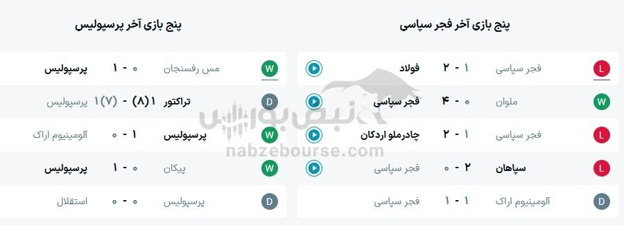 در پنج بازی اخیر 3 برد و 2 تساوی برای پرسپولیس حاصل شده است و همچنین در پنج بازی اخیر فجرسپاسی 3 باخت و 1 برد و 1 تساوی حاصل شده است.