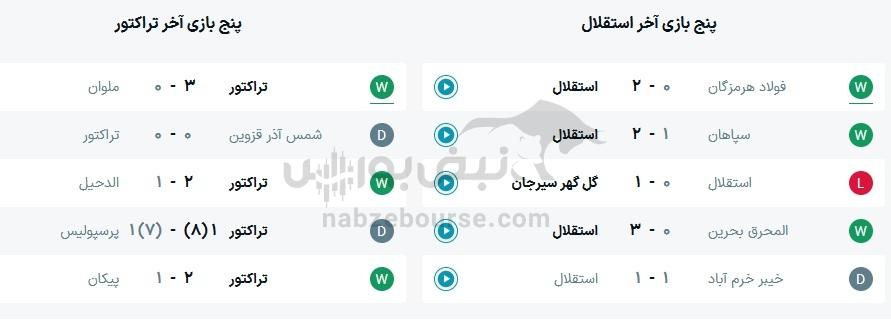 در پنج بازی اخیر استقلال 3 برد و 1 تساوی و 1 باخت حاصل شده است و همچنین در پنج بازی اخیر تراکتور 3 برد و 2 تساوی حاصل شده است.