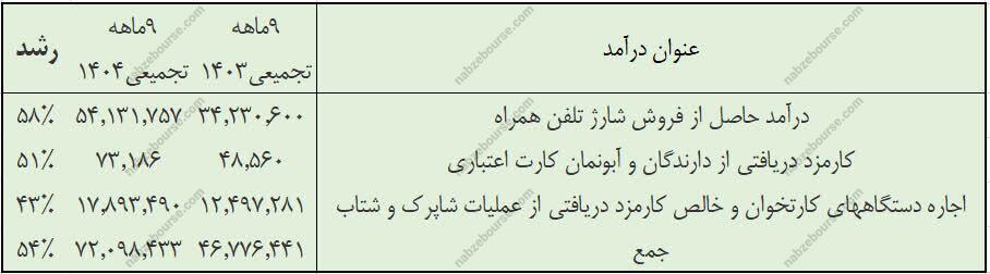 میانگین ۸ ماه ابتدایی سال ۷۸۰ میلیارد تومان میباشد. از درآمد ۹۵۰ میلیارد تومانی شرکت در آذرماه، ۷۲۲ میلیارد تومان مربوط به درآمد حاصل از فروش شارژ تلفن همراه و ۲۲۷ میلیارد تومان مربوط به اجاره دستگاه های کارتخوان میباشد.