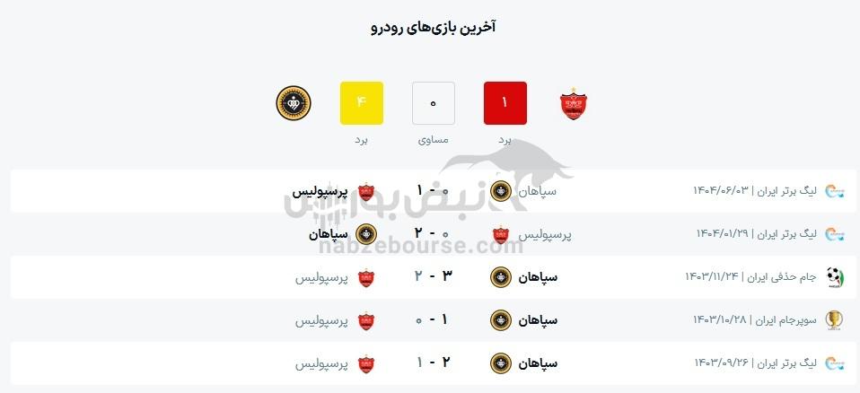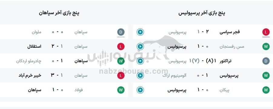 در پنج بازی اخیر پرسپولیس 3 برد و 1 تساوی و 1 باخت حاصل شده است و همچنین در پنج بازی اخیر سپاهان 2 برد و 1 تساوی و 2 باخت حاصل شده است.