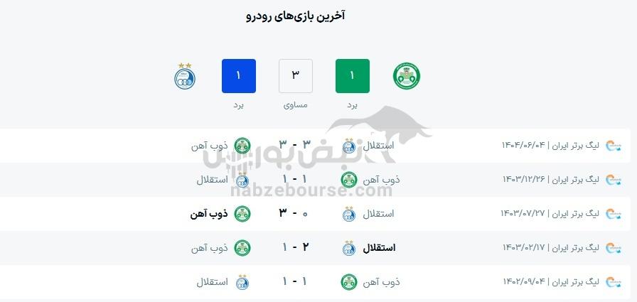 در پنج بازی اخیر استقلال 3 برد و 1 تساوی و 1 باخت حاصل شده است و همچنین در پنج بازی اخیر ذوب آهن 3 تساوی و 2 باخت حاصل شده است.