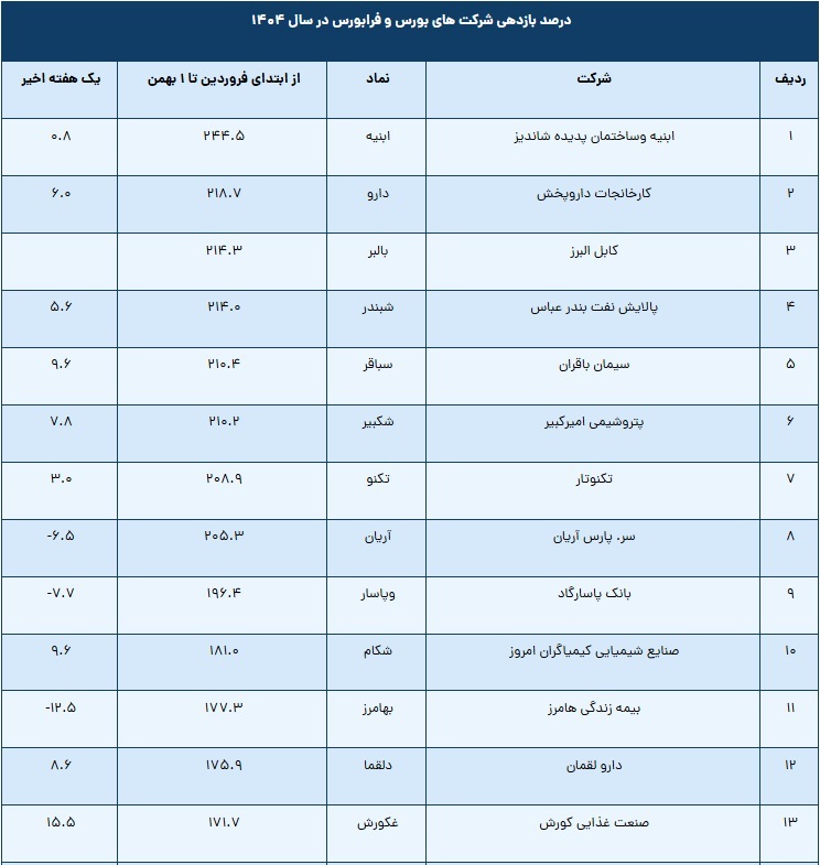 معرفی شرکتهای بورس و فرابورس با بیشترین بازدهی مثبت از ابتدای سال 1404 تا 1 بهمن
