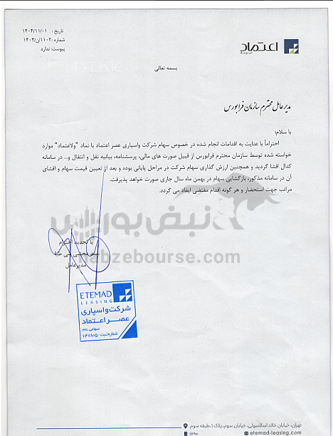 فرابورس ایران در اطلاعیهای رسمی اعلام کرد که در راستای فراهم شدن شرایط بازگشایی نماد ولاعتماد، طی سه نوبت مکاتبه رسمی در تاریخهای: