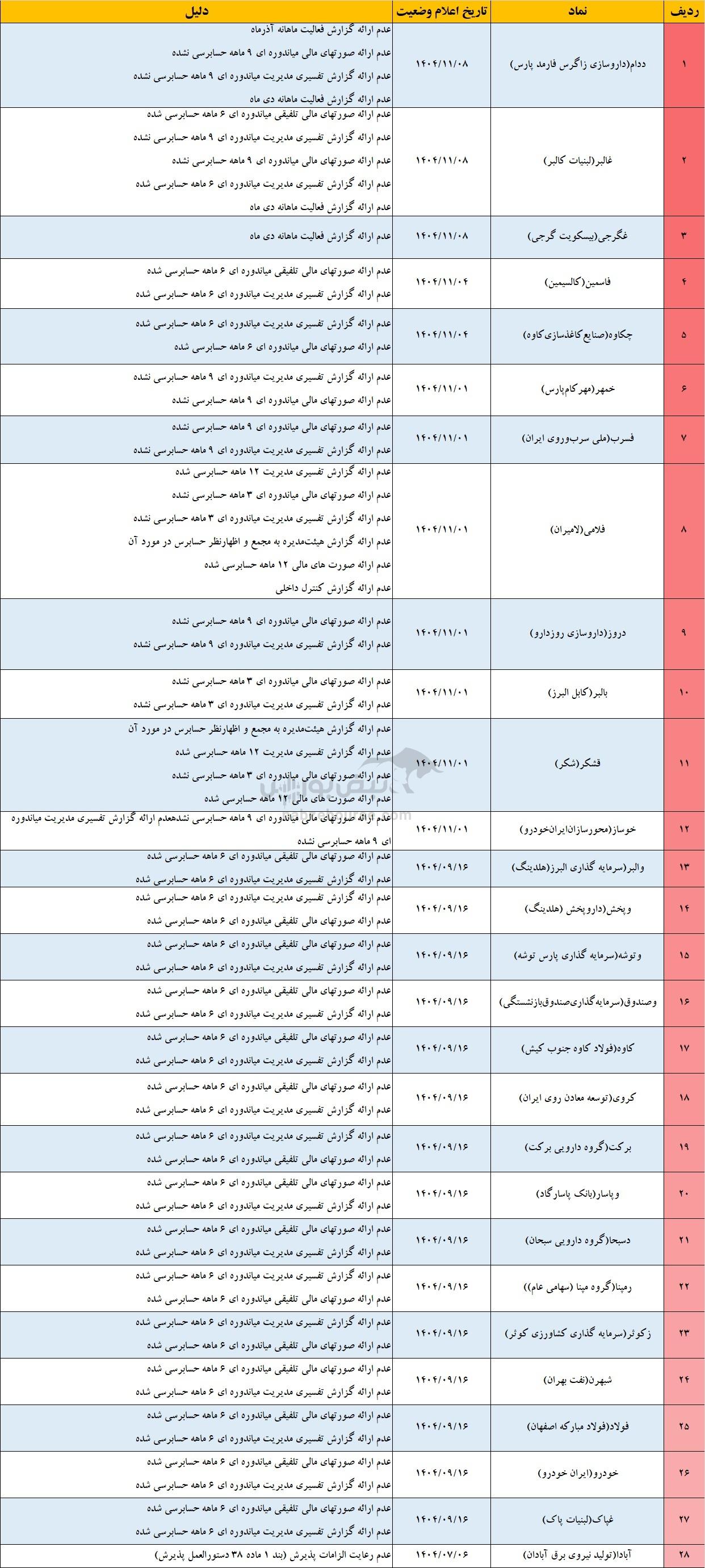 بررسیهای بورس تهران و فرابورس ایران نشان میدهد که در حال حاضر ۳۸ نماد بورسی و فرابورسی در وضعیت مشمول فرآیند تعلیق قرار دارند؛ شرایطی که زنگ خطری جدی برای سهامداران این شرکتهاست. در این حالت معاملات همچنان ادامه دارد، اما در صورت تداوم تخلفات یا عدم رفع دلایل، حکم تعلیق کامل نماد صادر خواهد شد. از میان این نمادها، ۲۸ نماد در بورس تهران و ۱۰ نماد در فرابورس مشمول این فرآیند شدهاند و سهامداران آنها باید با احتیاط بیشتری این نمادها را دنبال کنند. این نماد کدامند؟