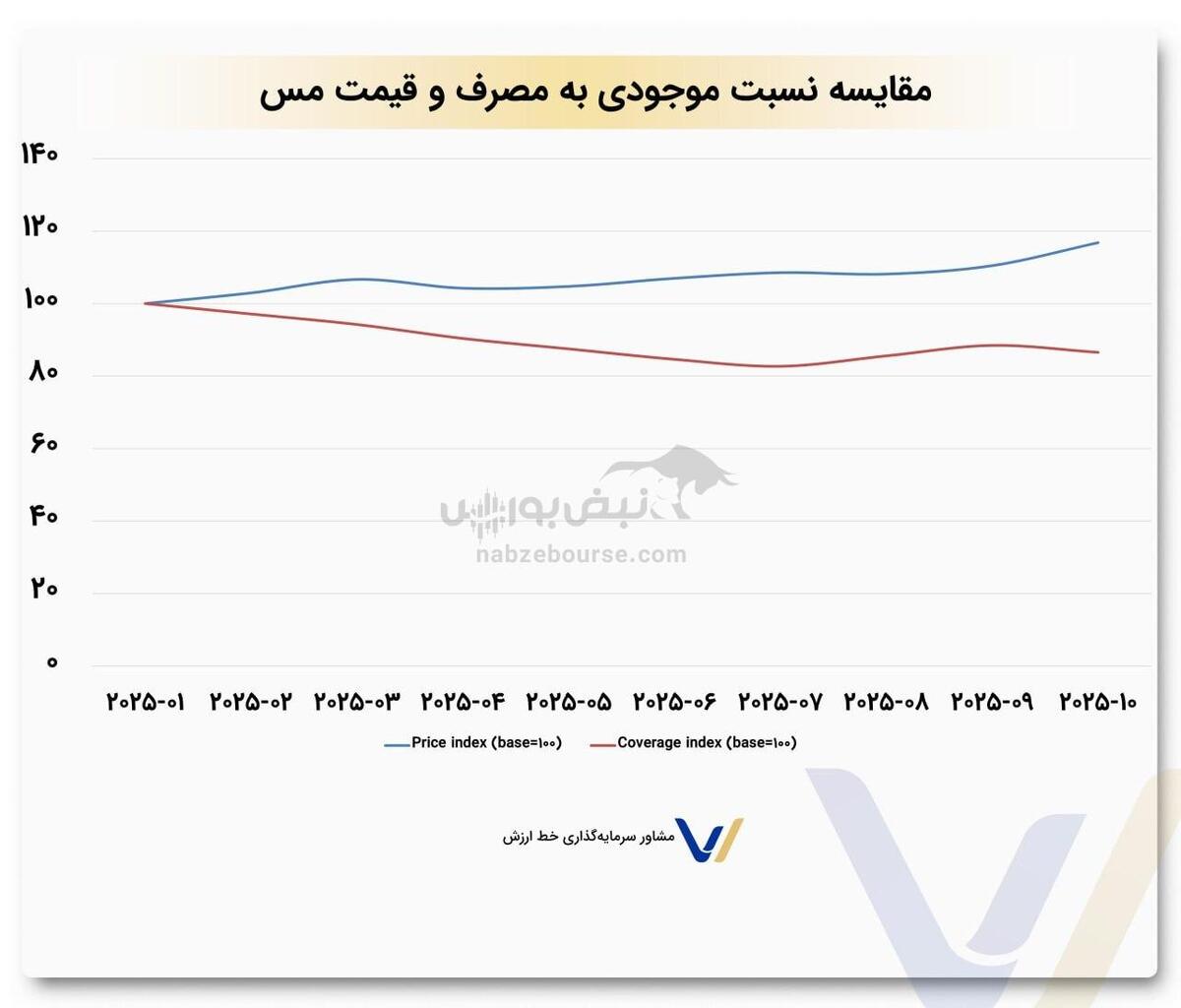 نمودار فوق روند تغییرات بازار مس را در ۱۰ ماهه سال ۲۰۲۵ به تصویر میکشد و بیانگر همبستگی معکوس میان «شاخص قیمت» (خط آبی) و «شاخص پوشش موجودی» (خط قرمز) است. همانطور که مشاهده میشود، با نزولی شدن روند موجودی انبارها، شاخص قیمت با شیبی ملایم اما پیوسته مسیر صعودی را طی کردهاست.