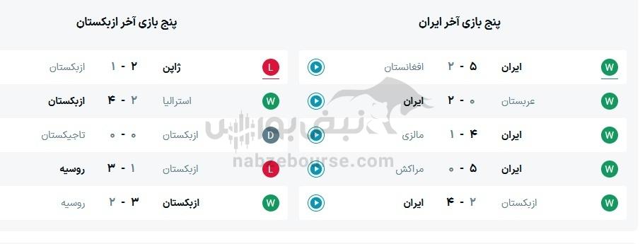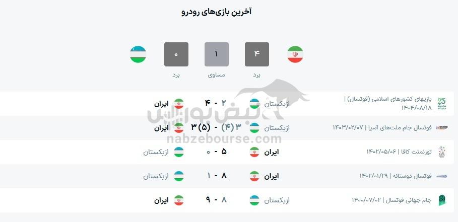 در پنج بازی اخیر تیم ملی فوتسال ایران 5 برد حاصل شده است و همچنین در پنج بازی اخیر تیم ملی فوتسال ازبکستان 2 برد و 2 باخت و 1 تساوی حاصل شده است.