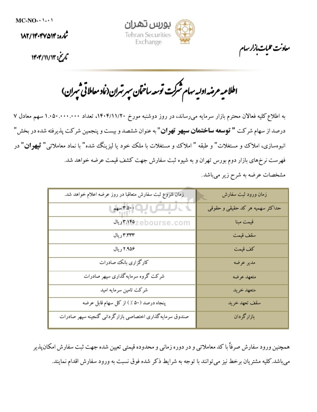 به گزارش نبض بورس، بیستمین عرضه اولیه امسال مربوط به شرکت توسعه ساختمان سپهر تهران است که قرار است روز دوشنبه ۲۰ بهمن ۱۴۰۴، هفت درصد از سهام خود را با نماد معاملاتی «ثپهران» در بورس تهران عرضه کند. این شرکت به‌عنوان ششصد و بیست و پنجمین نماد جدید بازار سرمایه، در گروه انبوه‌سازی، املاک و مستغلات پذیرفته شده است.