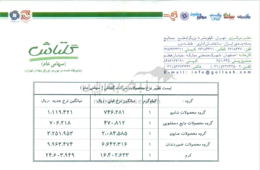 همچنین شرکت گلتاش (نماد شگل) با استناد به مجوز صادره از سوی انجمن صنایع شوینده، بهداشتی و آرایشی ایران اعلام کرد نرخ فروش محصولات این شرکت شامل انواع خمیر دندان، مایع دستشویی، کرم و شامپو در بهمن‌ماه ۱۴۰۴ افزایش یافته است.