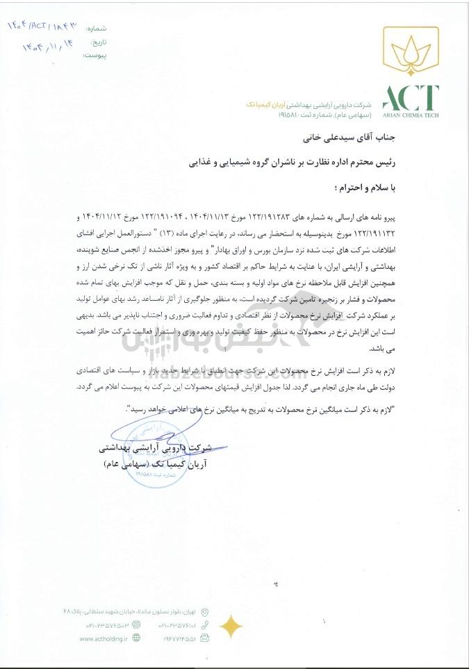 شرکت دارویی آرایشی بهداشتی آریان کیمیا تک نیز با انتشار اطلاعیه‌ای در سامانه کدال از افزایش نرخ فروش محصولات خبر داد.