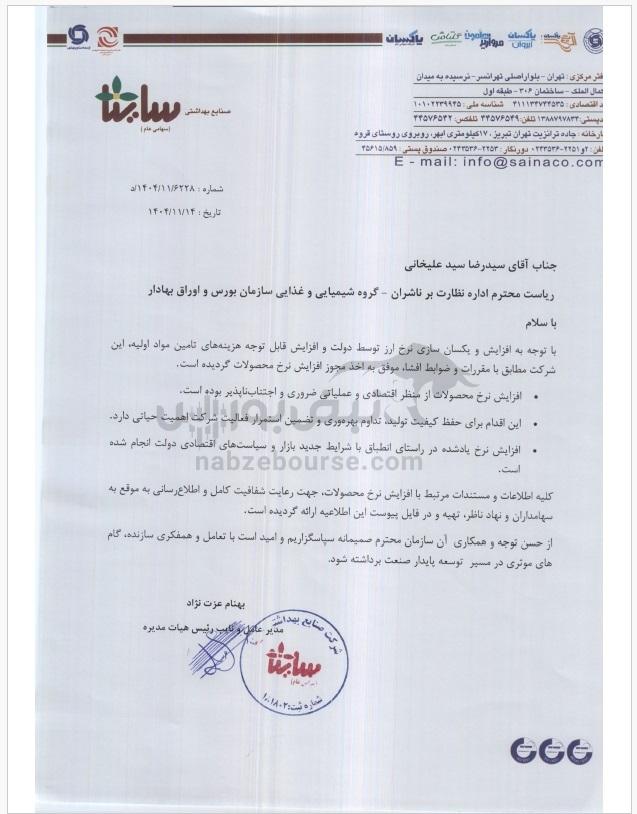 شرکت صنایع بهداشتی ساینا نیز در اطلاعیه‌ای جداگانه تأکید کرد افزایش نرخ فروش محصولات از منظر اقتصادی و عملیاتی، اقدامی ضروری و اجتناب‌ناپذیر بوده و برای حفظ کیفیت تولید، تداوم بهره‌وری و استمرار فعالیت شرکت اهمیت حیاتی دارد.