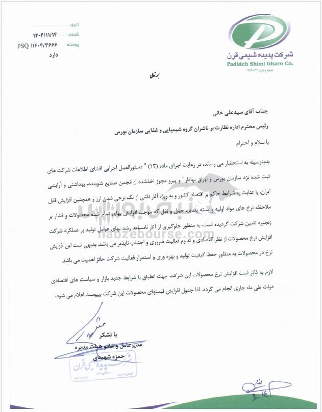 شرکت پدیده شیمی قرن با انتشار نامه‌ای خطاب به سازمان بورس و اوراق بهادار، از اعمال افزایش نرخ در محصولات خود خبر داد.