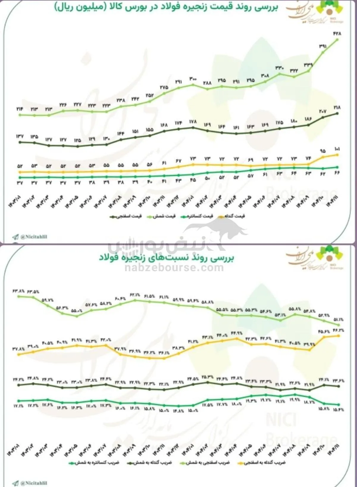 بررسی روند قیمت و ضریب زنجیره فولاد در بورس کالا