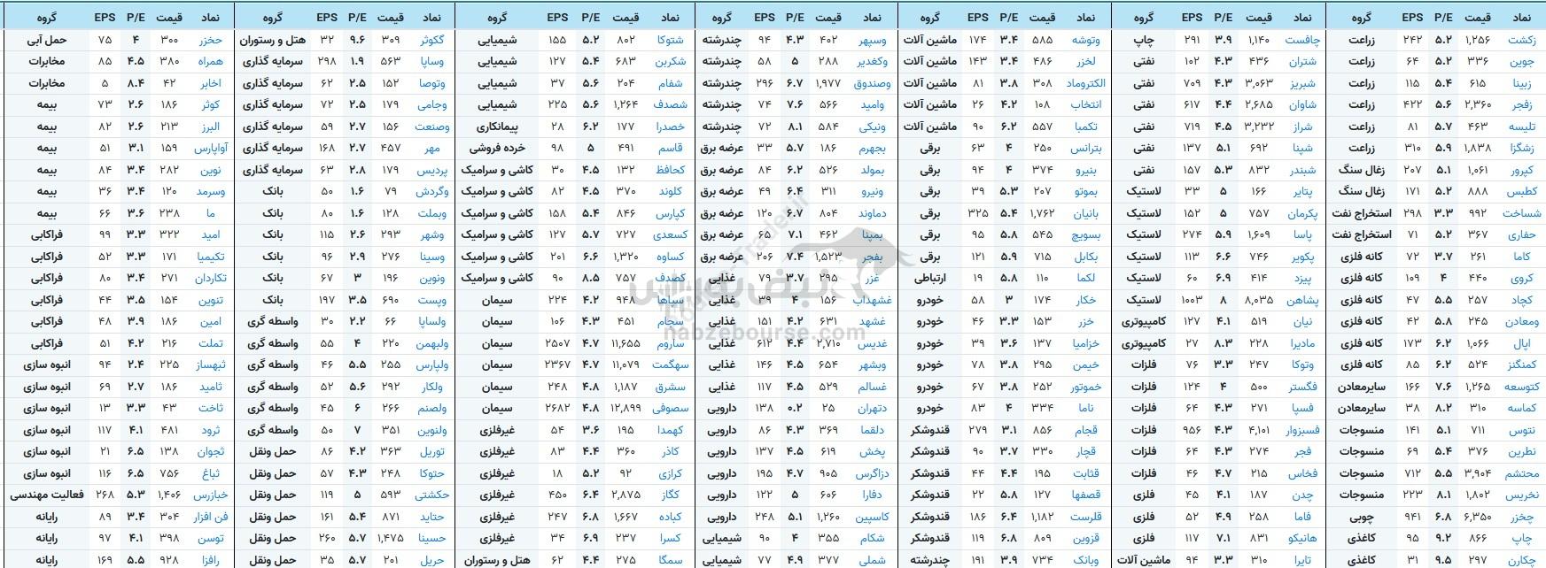 بررسی جدول P/E نمادهای بورسی نشان می‌دهد سهامی که با P/E کمتر از ۵ معامله می‌شوند، عمدتاً در صنایع بانکی، سرمایه‌گذاری، فلزات اساسی، غذایی، سیمان و حمل‌ونقل متمرکز هستند. این نمادها معمولاً از سودآوری فعلی قابل اتکا برخوردارند اما بازار برای رشد آتی آن‌ها انتظارات محدودی در نظر گرفته است.