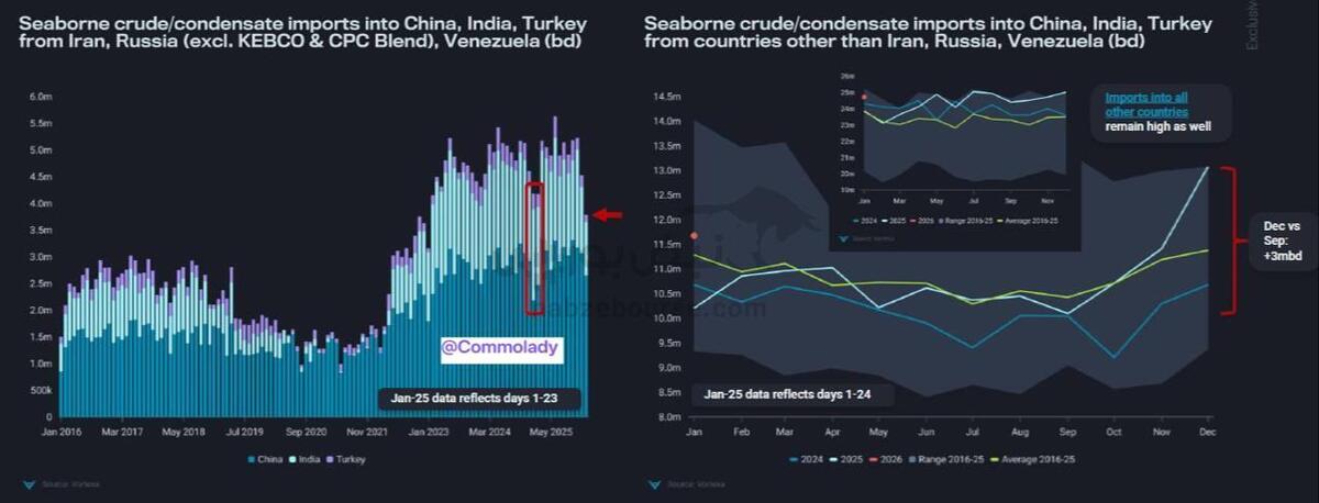 به گزارش نبض بورس، طبق آمار Vortexa ،واردات نفت تحریمی(روسیه،ایران و ونزوئلا) به چین، هند و ترکیه در ماه ژانویه به پایینترین سطح سهسال اخیر رسیده است و نفتهای جریان اصلی بهعنوان جایگزین وارد شدند.