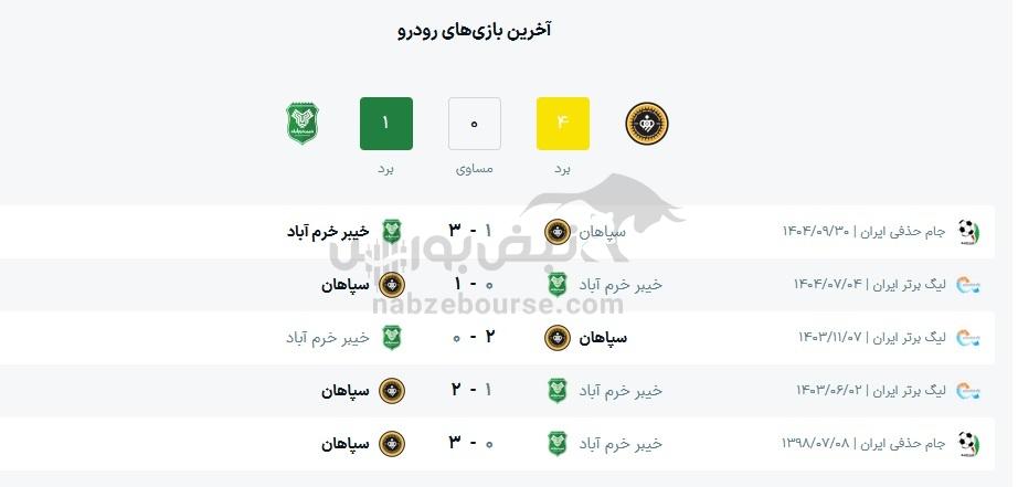 در پنج بازی اخیر سپاهان 3 باخت و 2 تساوی حاصل شده است و همچنین در پنج بازی اخیر خیبر خرم آباد 2 باخت و 3 تساوی حاصل شده است.