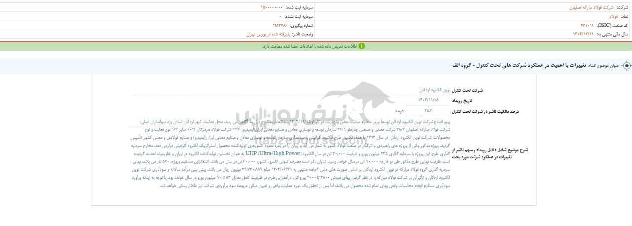 موضوع افشا مربوط به تغییرات مهم در عملکرد شرکتهای تحت کنترل از جمله نوین الکترود اردکان بود که شرکت فولاد مبارکه ۳۸.۳٪ از سهام آن را در اختیار دارد.