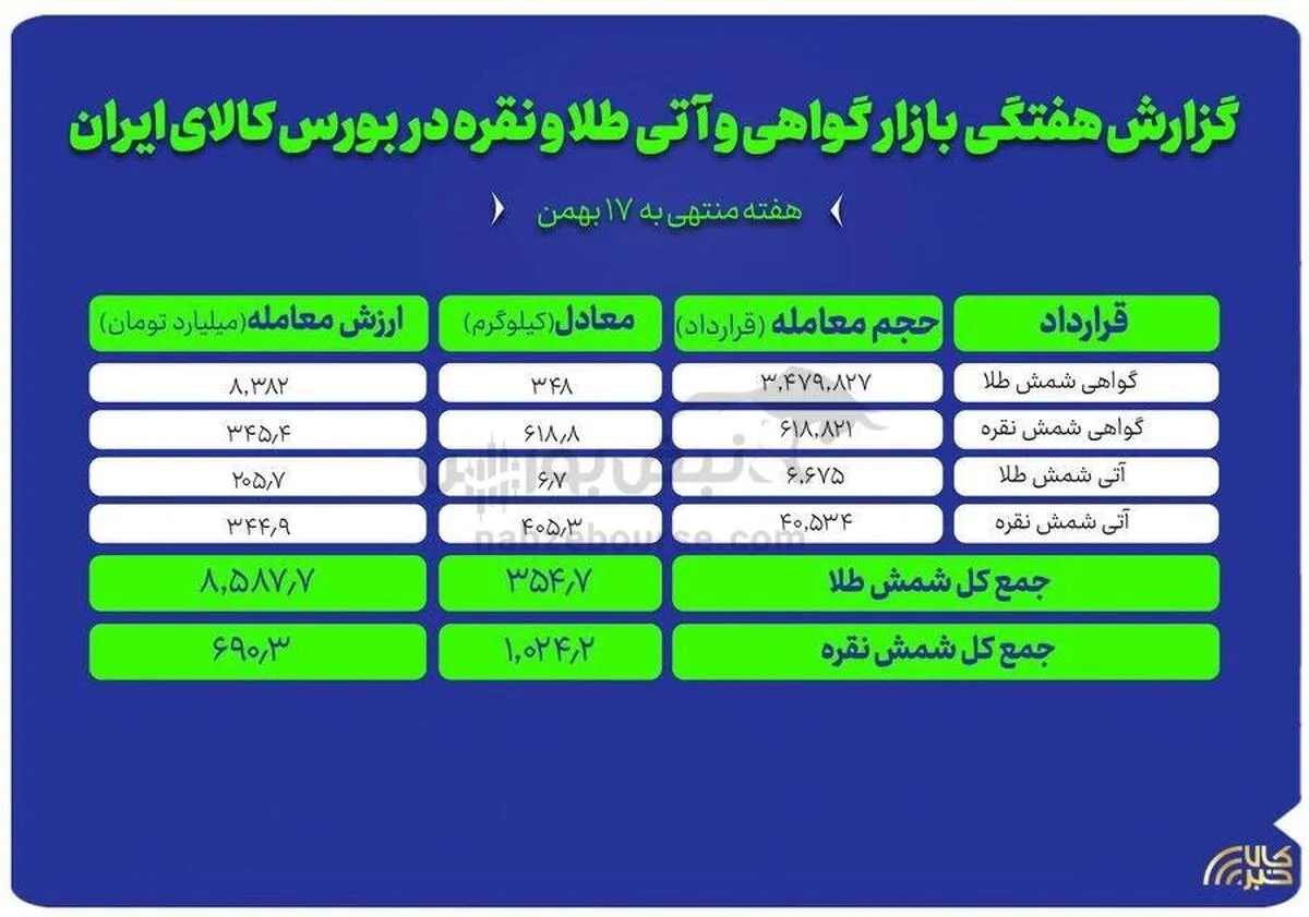 بررسی عملکرد ابزارهای مبتنی بر طلا و نقره در بورس کالای ایران نشان می‌‎دهد که در هفته گذشته بیش از یک تن شمش نقره و حدود ۳۵۵ کیلوگرم شمش طلا در بازار گواهی سپرده و آتی معامله شد.