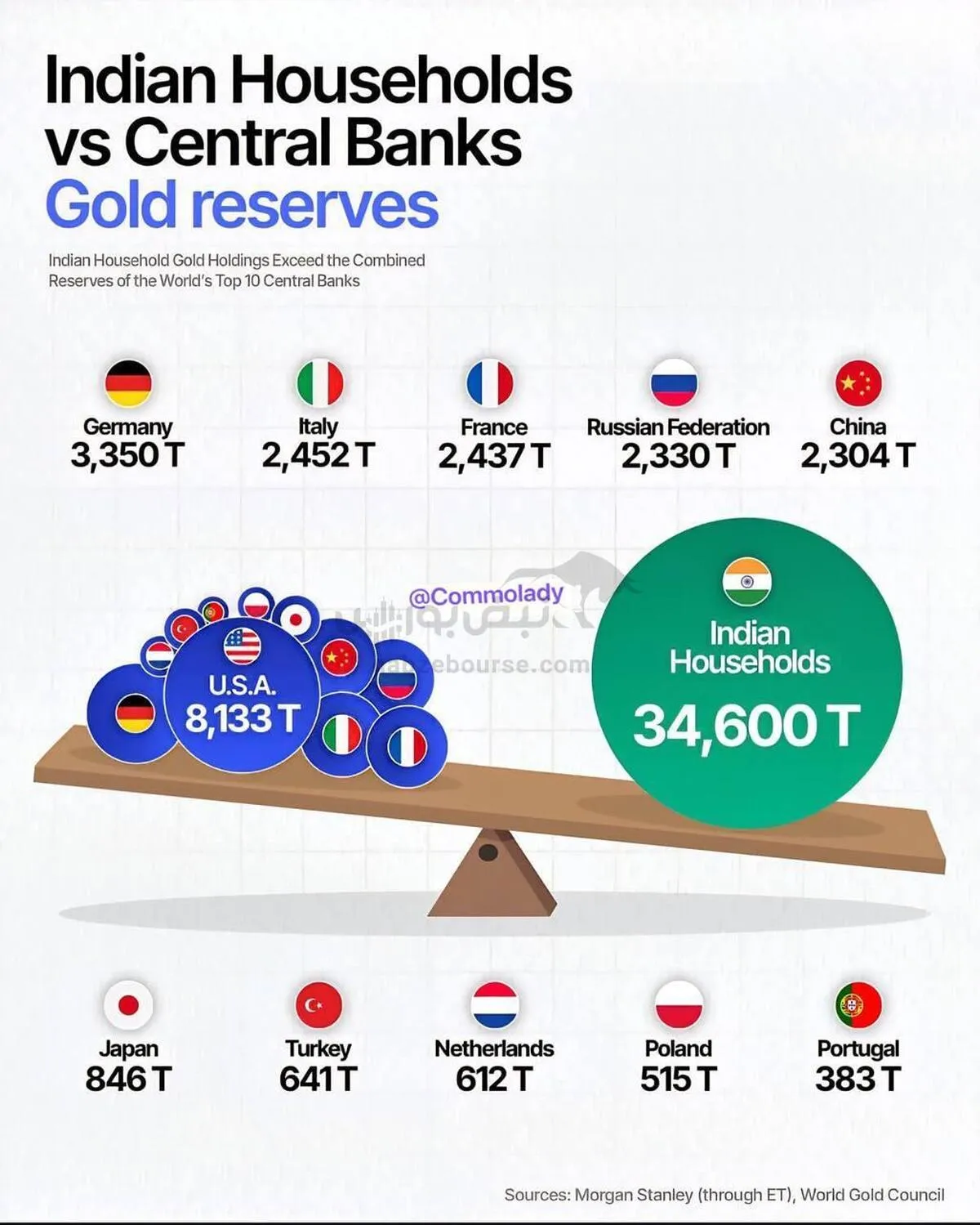 حتی مجموع ذخایر ۱۰ بانک مرکزی بزرگ هم به سطح طلای نگهداری‌شده توسط مردم هند نمی‌رسد.