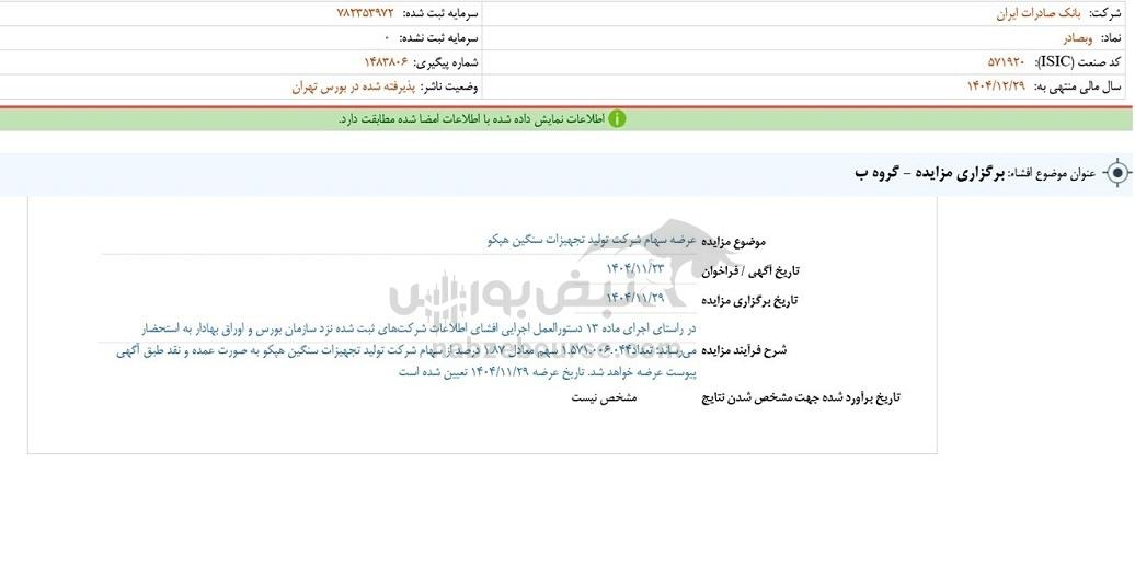 بانک صادرات ایران اعلام کرد؛ تعداد ۱.۵۷۱.۰۰۶.۰۴۴ سهم معادل ۱.۸۷ درصد از سهام شرکت تولید تجهیزات سنگین هپکو به صورت عمده و نقد خواهد شد. تاریخ عرضه ۱۴۰۴.۱۱.۲۹ تعیین شده است.