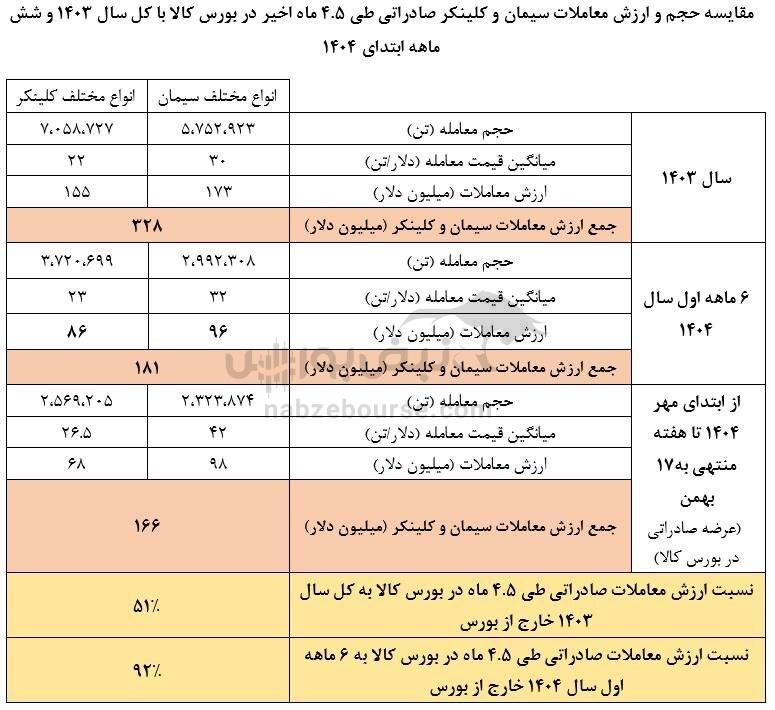 جدول ذیل نشان میدهد طی ۴.۵ ماه گذشته، در مجموع حدود ۴.۹ میلیون تن سیمان و کلینکر در رینگ صادراتی بورس کالا معامله شده که ارزش آن به حدود ۱۶۶ میلیون دلار رسیده است. این در حالی است که ارزش صادرات ۱۲.۸ میلیون تن سیمان و کلینکر در کل سال ۱۴۰۳ حدود ۳۲۸ میلیون دلار بوده و به این ترتیب، فقط در ۴.۵ ماه اخیر بیش از ۵۱ درصد ارزش صادرات سال گذشته محقق شده است.