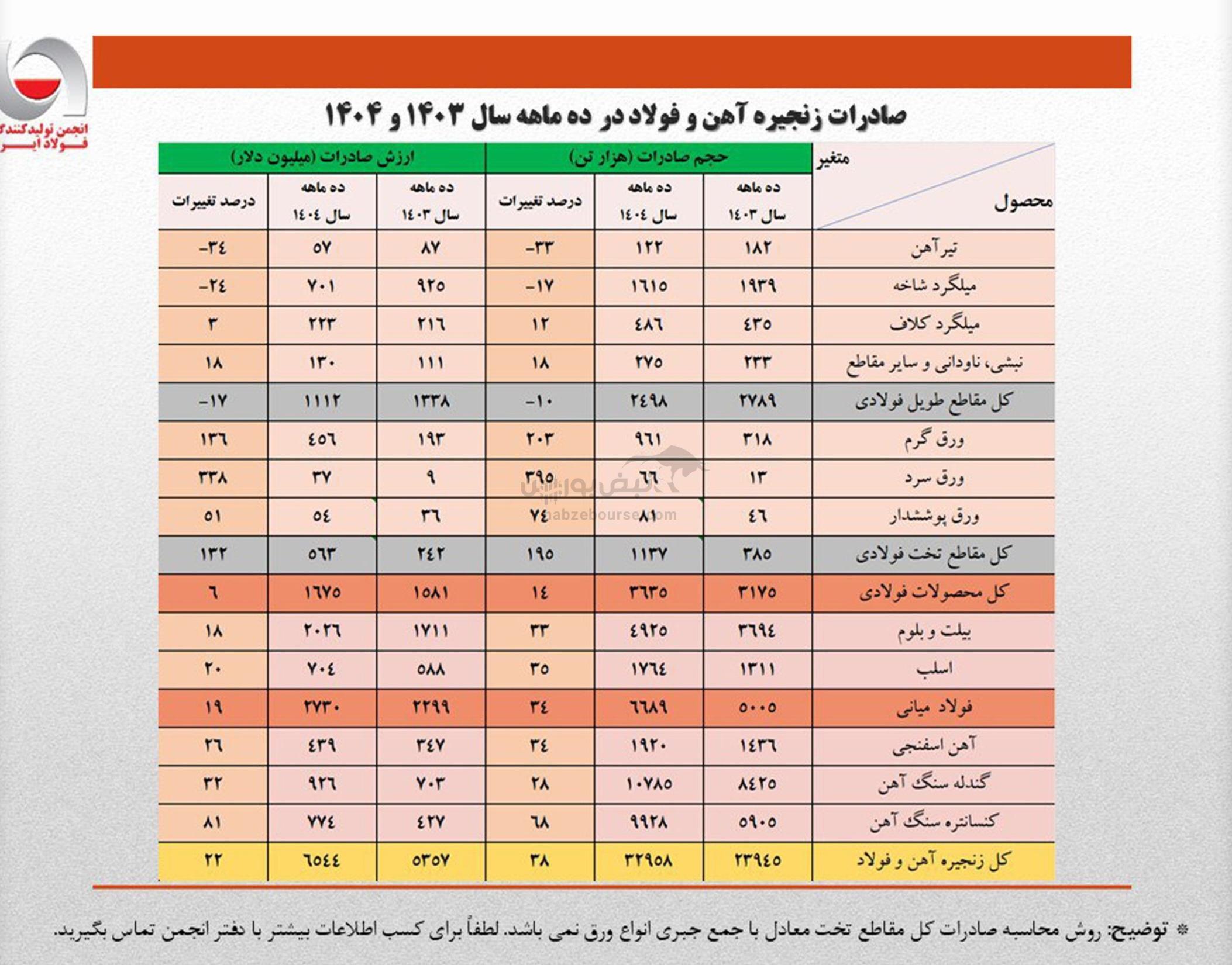 به گزارش نبض بورس، انجمن تولیدکنندگان فولاد ایران آمار صادرات ۱۰ ماهه سال ۱۴۰۴ زنجیره فولاد کشور را منتشر کرد که بر این اساس حجم صادرات آهن و فولاد کشور، ۲۷ درصد و مجموع حجم صادرات کل زنجیره فولاد ۳۸ درصد افزایش داشته است.