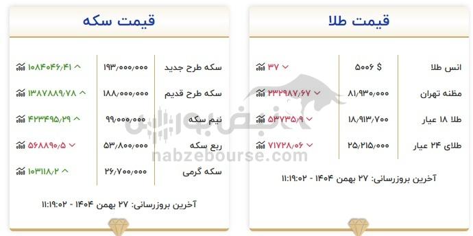 در بازار امروز هر سکه گرمی با افزایش نسبت به روز گذشته ۲۶،۷۰۰،۰۰۰ (بیست و شش میلیون و هفتصد هزار) تومان نرخ گذاری شد.