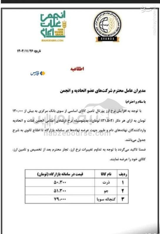 به گزارش نبض بورس، انجمن غلات ایران روز گذشته در نامهای به مدیران عامل شرکتهای عضو این اتحادیه و انجمن اعلام کرد که با توجه به افزایش نرخ ارز پرتال تأمین کالای اساسی از سوی بانک مرکزی به بیش از ۱۳۰ هزار تومان، نرخهای ارشادی جدید برای عرضه نهادههای دامی و طیور در سامانه بازارگاه تا اطلاع ثانوی تعیین شده است.