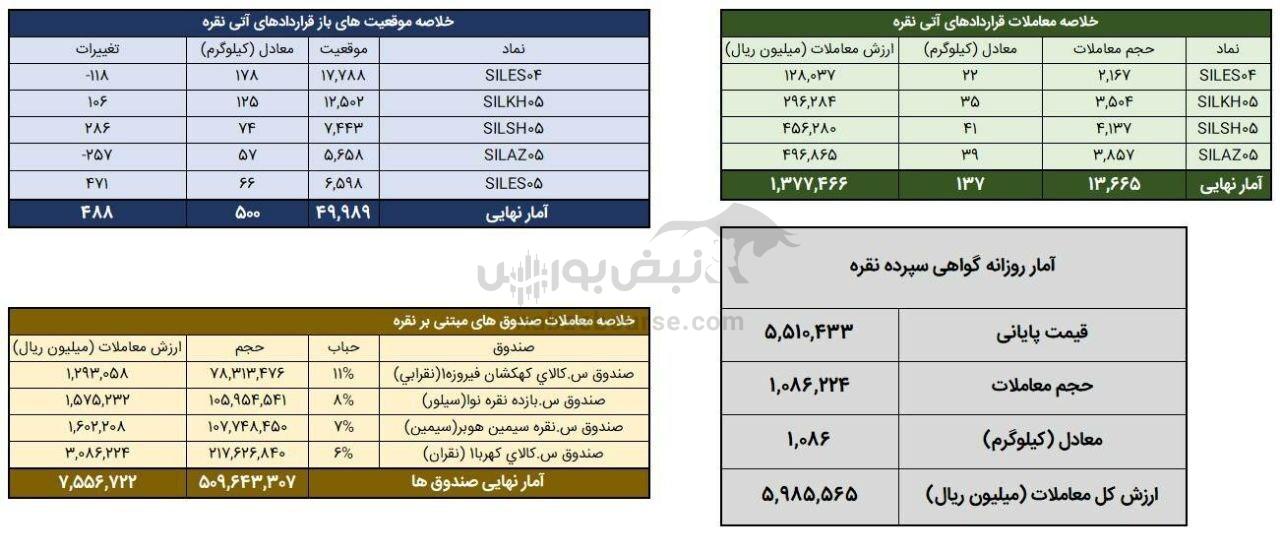 روز گذشته (۲۷ بهمن ماه) درمجموع یک تن و ۲۲۳ کیلوگرم شمش نقره در بازار گواهی سپرده و قرارداد آتی بورس کالا مورد معامله قرار گرفت. ارزش معاملات صندوق های مبتنی بر نقره نیز به بیش از ۷۵۵.۷ میلیارد تومان رسید.