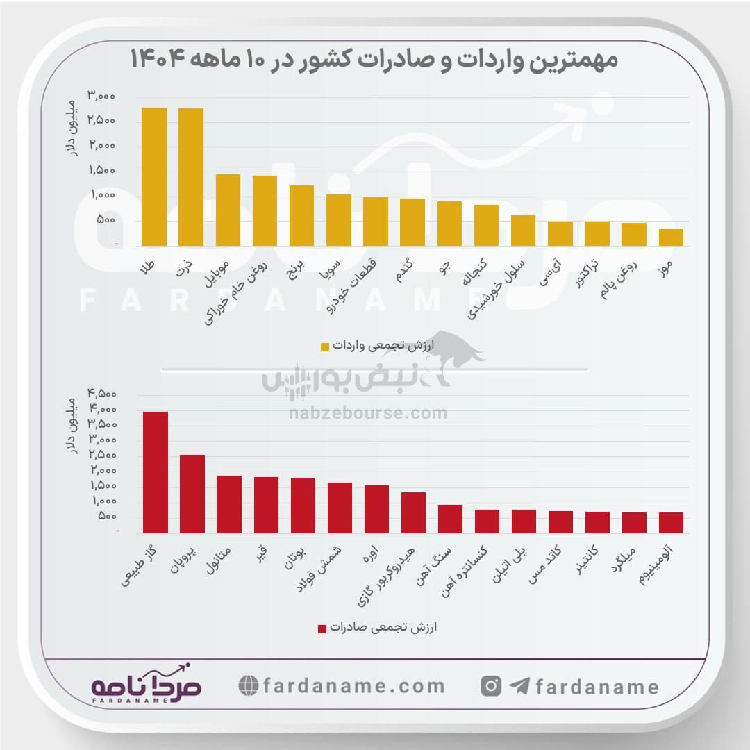 مهمترین اقلام وارداتی و صادراتی ۱۰ ماهه سال جاری را در نمودار نشان داده شده است. مجموع ارزش صادرات ۴۵ میلیارد دلار و مجموع ارزش واردات ۴۹ میلیارد دلار بوده و تراز تجاری ۱۰ ماهه، منفی ۴ میلیارد دلار است.