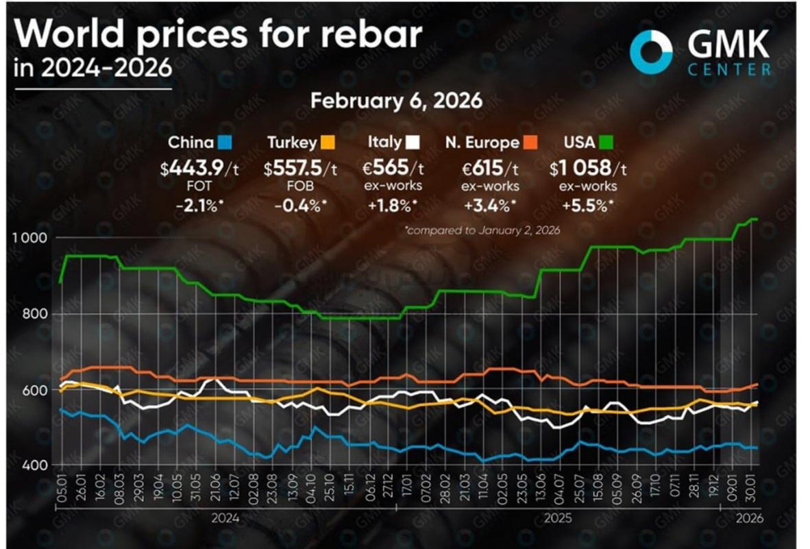 طبق دادههای منتشرشده در این گزارش، تا تاریخ ۶ فوریه ۲۰۲۶ نرخ میلگرد در بازار آمریکا به ۱۰۵۸ دلار به ازای هر تن (تحویل درب کارخانه) افزایش یافت که بیانگر رشد ۵.۵ درصدی نسبت به ابتدای ژانویه است.