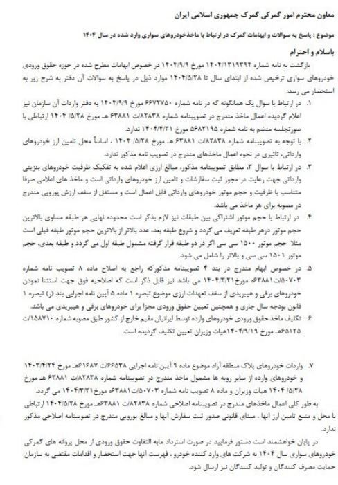 ابهامات مختلف برای واردات خودرو از سوی وزارت صمت شفاف شد؛ به طوری که مدیر کل دفتر واردات گمرک ایران در بخشنامه‌ای به گمرکات اعلام کرد، به پیوست نامه شماره ۶۹۱۴۰۳۲ مورخ ۱۴۰۴/۱۰/۰۸ معاونت محترم برنامه ریزی و مقررات سازمان توسعه تجارت ایران و نامه شماره ۶۶۷۲۱۳۹ مورخ ۱۴۰۴/۰۹/۰۹ دفتر مقررات صادرات و واردات در خصوص ماخذ حقوق ورودی انواع خودرو سواری در سال جاری ابلاغ میشود.