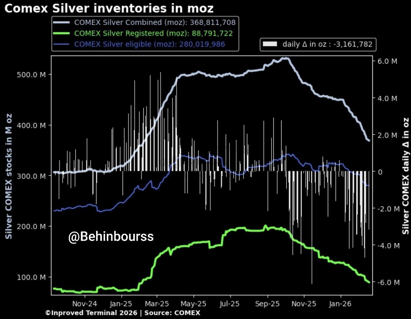 به گزارش نبض بورس، با نزدیک شدن به زمان تحویل ماه مارس، روند خروج فیزیکی نقره از انبارهای COMEX شدت یافته است. در روز سه‌شنبه تنها، ۳.۲ میلیون اونس نقره (۹۸ تن) برداشت شد.