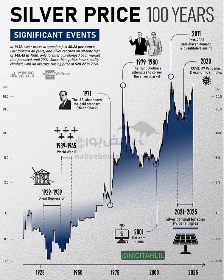 به گزارش نبض بورس، نگاهی ساده به روند قیمت نقره (به ازای هر اونس تروا، دلار آمریکا) طی یک قرن گذشته :