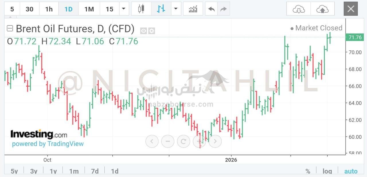 نفت با وجود افت جزئی روزانه، در مسیر ثبت رشد هفتگی بیش از ۵٪ قرار گرفت؛ تشدید تنش میان آمریکا و ایران و ضرب‌الاجل ۱۰ تا ۱۵ روزه واشنگتن به تهران، نگرانی از اختلال عرضه را افزایش داده است