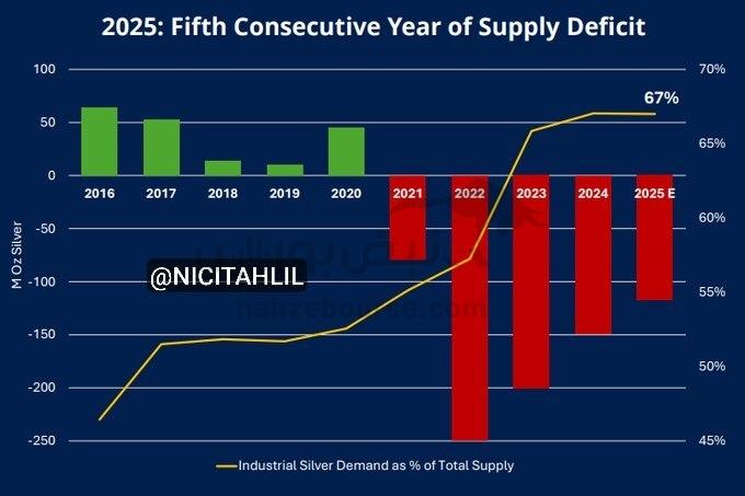به گزارش نبض بورس، همچنین، تقاضای صنعتی نقره به ۶۷٪ از تقاضای کل رسیده است.