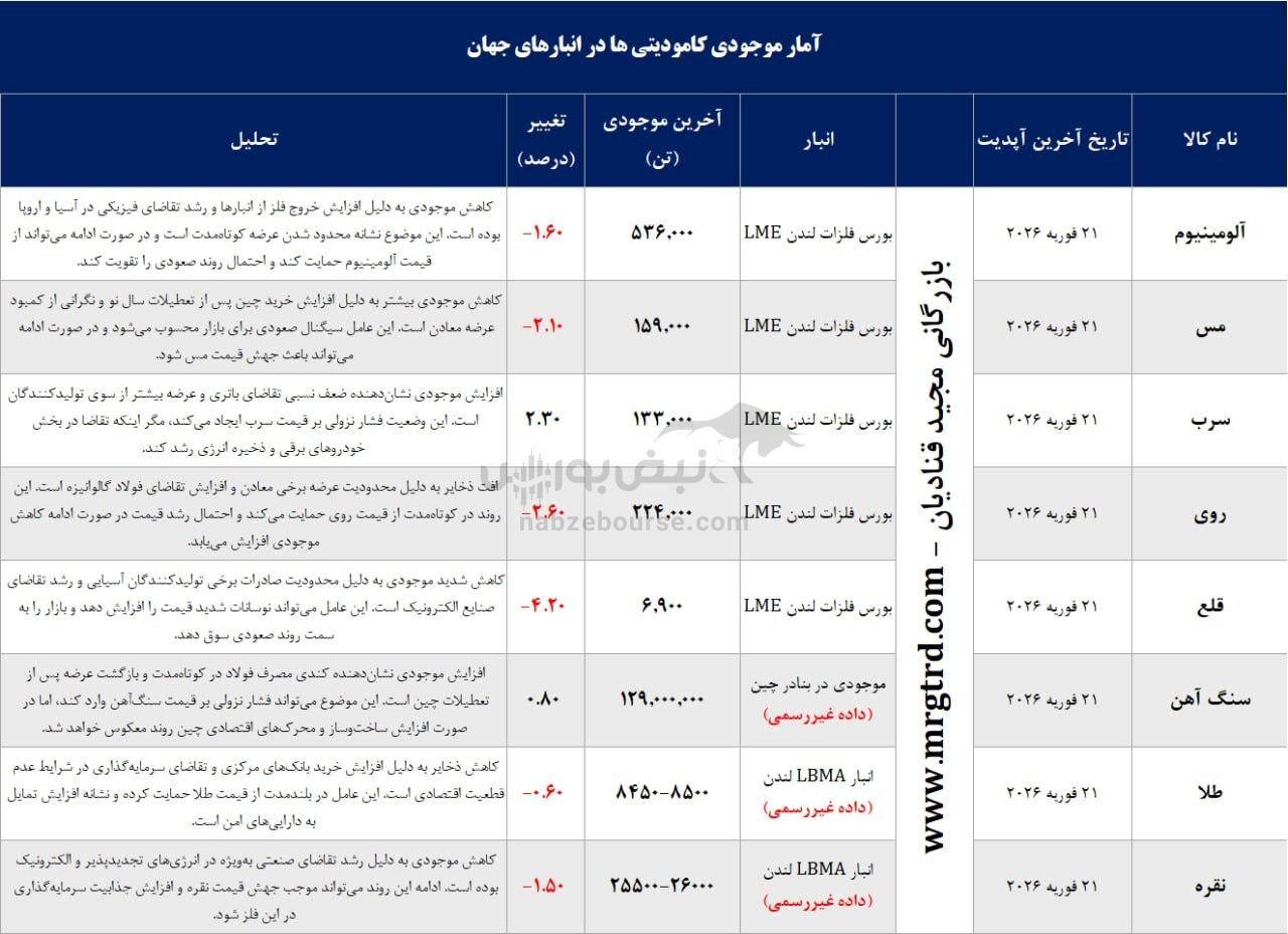 به گزارش نبض بورس، آمار کامودیتی ها در انبارهای جهان، محصولات سرب و سنگ آهن با افزایش موجودی همراه بوده اند و محصولات مس، آلومینیوم، روی، قلع، طلا و نقره با کاهش موجودی همراه بوده اند.