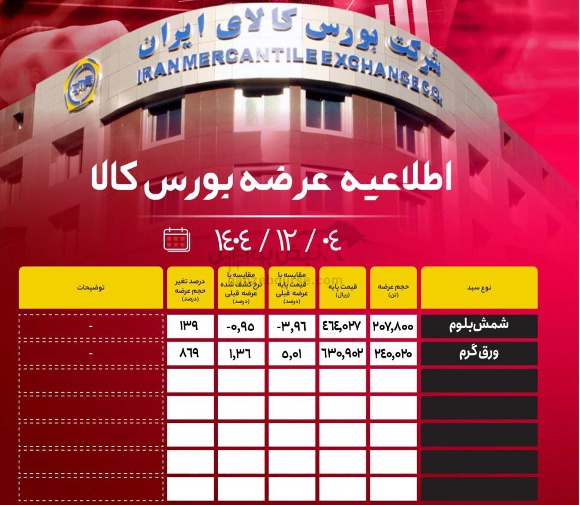 بر اساس این اطلاعیه، ۲۰۷ هزار و ۸۰۰ تن شمش بلوم نیز با قیمت پایه ۴۶۴ هزار و ۲۷ ریال عرضه شده است. میزان عرضه این محصول نسبت به آخرین معاملات ۱۳۹ درصد افزایش و قیمت پایه ۳٫۹۶ درصد کاهش داشته است.