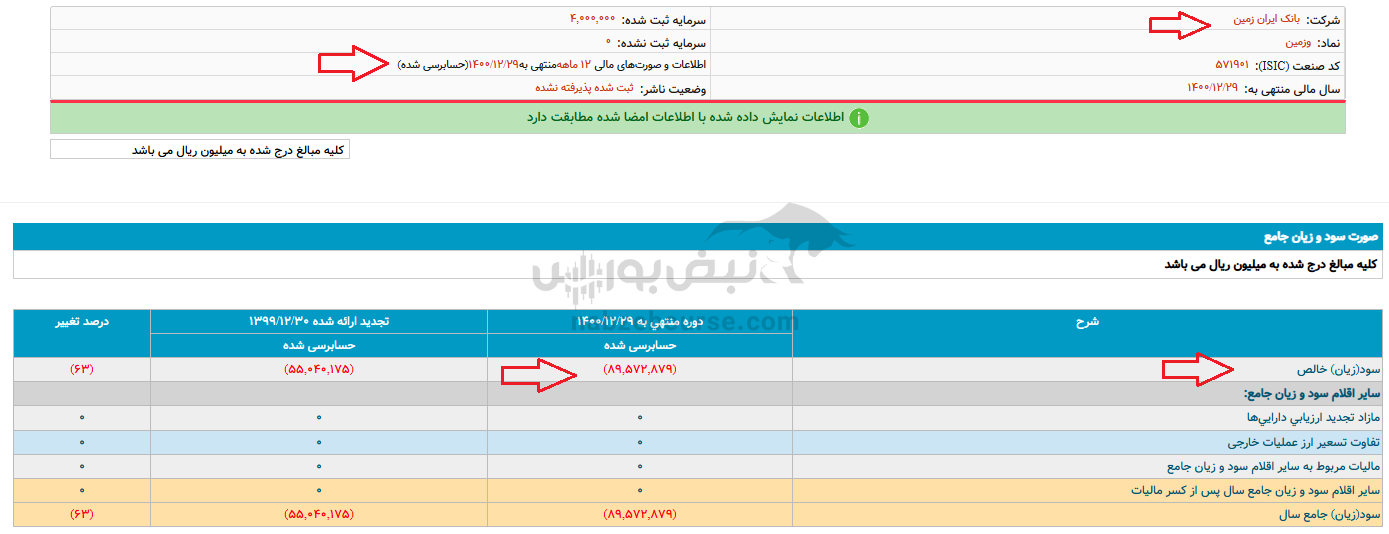 به گزارش نبض بورس؛ بر اساس اطلاعات رسمی حسابرس مستقل، بانک ایران زمین با سرمایه ثبتشده تنها ۴۰۰ میلیارد تومان، در دوازدهماهه سال ۱۴۰۰ بیش از ۸ هزار و ۹۰۰ میلیارد تومان زیان خالص شناسایی کرده است؛ رقمی که نسبت به سال پیش از آن، افزایشی ۶۳ درصدی را نشان میدهد.