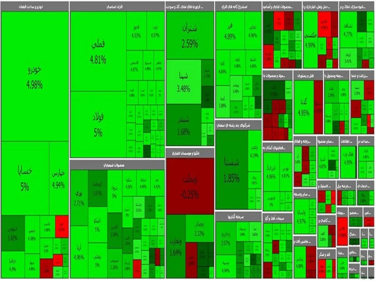 ارزش اولیه نمادهای دارای صفهای خرید از 2.5 همت به 1.53 همت رسید. ارزش صف های فروش هم از 19.3 میلیارد تومان به 54.6 میلیارد تومان رسید. قیاس ارزش صف ها نشان میدهد که فروشندگان فاصله بسار زیادی نسبت به خریداران دارند. این در حالی است که تعداد نمادهای دارای صف خرید (202 نماد) بیش از 9 برابر تعداد نمادهای دارای صف فروش (27 نماد) است. امروز همچنین 190 نماد بیش از 2.5 درصد افزایش قیمت و 50 نماد بیش از 2.5 درصد کاهش قیمت را تجربه کردند.