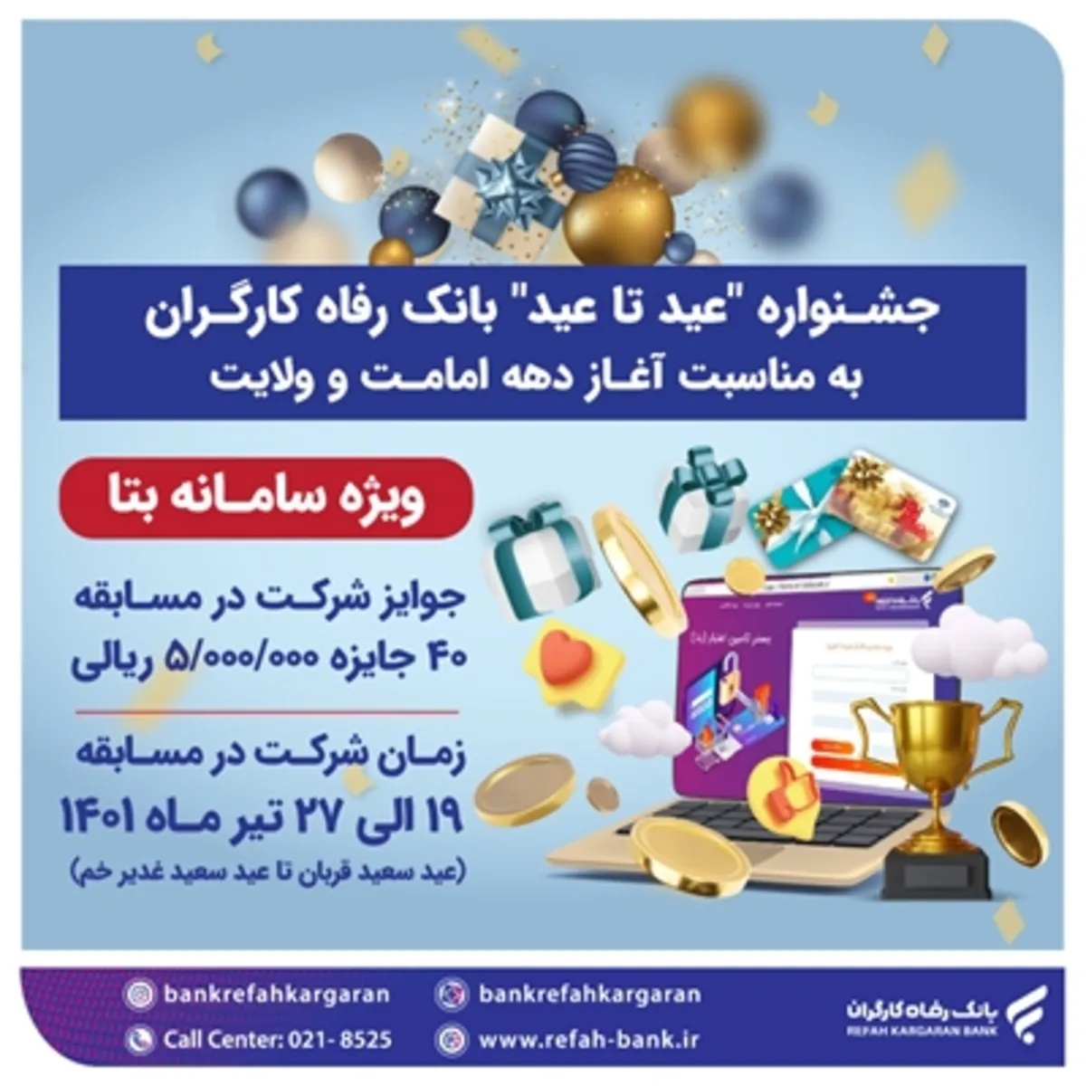 لازم به ذکر است، علاقهمندان واجد شرایط میتوانند برای کسب اطلاعات بیشتر در خصوص جشنواره عید تا عید بانک رفاه کارگران و شرکت در مسابقه این جشنواره به سایت بانک به نشانی: www.refah-bank.ir مراجعه کنند.