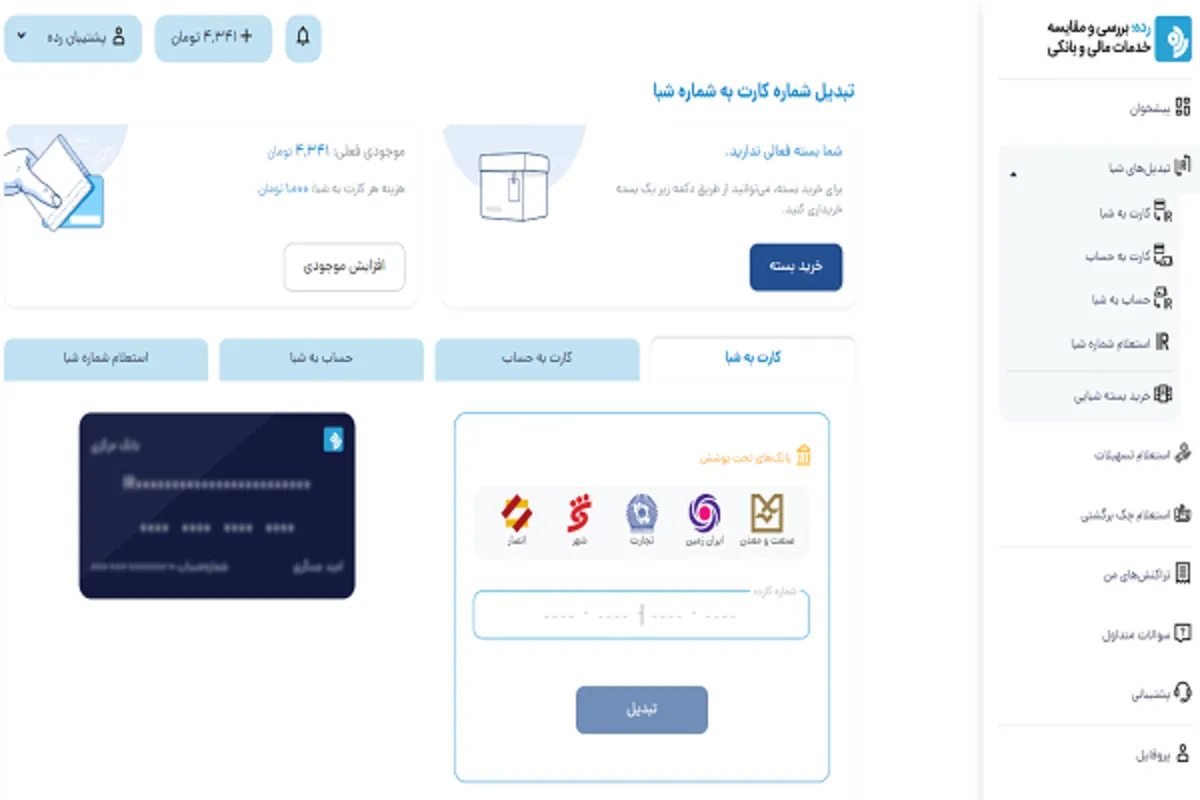 - در «رده» این امکان وجود دارد که براساس شماره کارت یا حساب، شماره شبا خودتان را بگیرید. برای تبدیل شماره کارت به شبا، روی بخش «کارت به شبا» بزنید و در کادر مشخص شده، شماره کارت ۱۶رقمی را تایپ و پنجره تبدیل را «لمس» کنید. اگر هم شماره حساب را دارید، همان گزینه را انتخاب و بعد از وارد کردن شماره حساب شماره شبا رایگان را تحویل میگیرید.