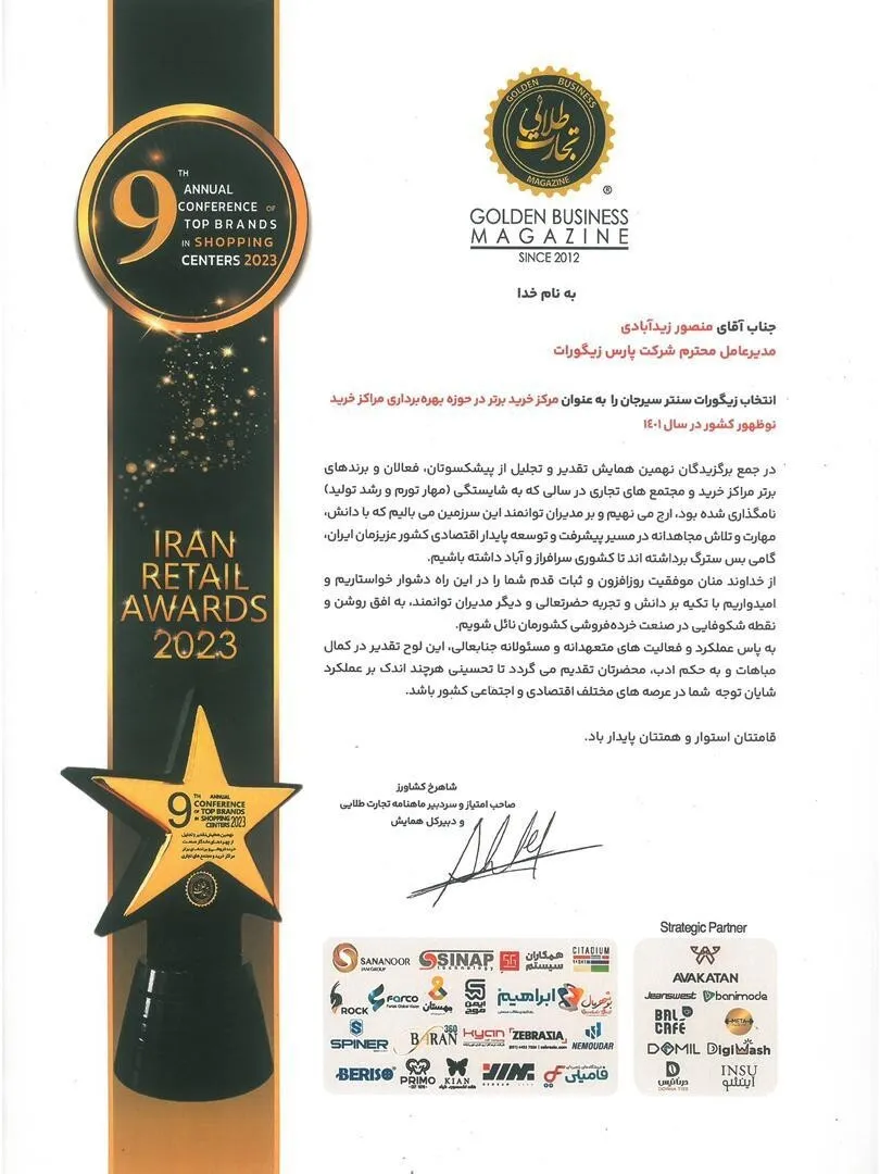 به گزارش روابط عمومی گروه مالی گردشگری، نهمین همایش تقدیر و تجلیل از برترین های مراکز خرید و فروشگاههای زنجیرهای ایران IRAN RETAIL AWARDS با حضور مدیران و مالکان مراکز خرید تجاری کشور برگزار و از منصور زیدآبادی نژاد به عنوان مدیرعامل شرکت توسعه مجتمع های خدماتی رفاهی پارس زیگورات با اهدای لوح تقدیر و نشان برتر تقدیر شد.